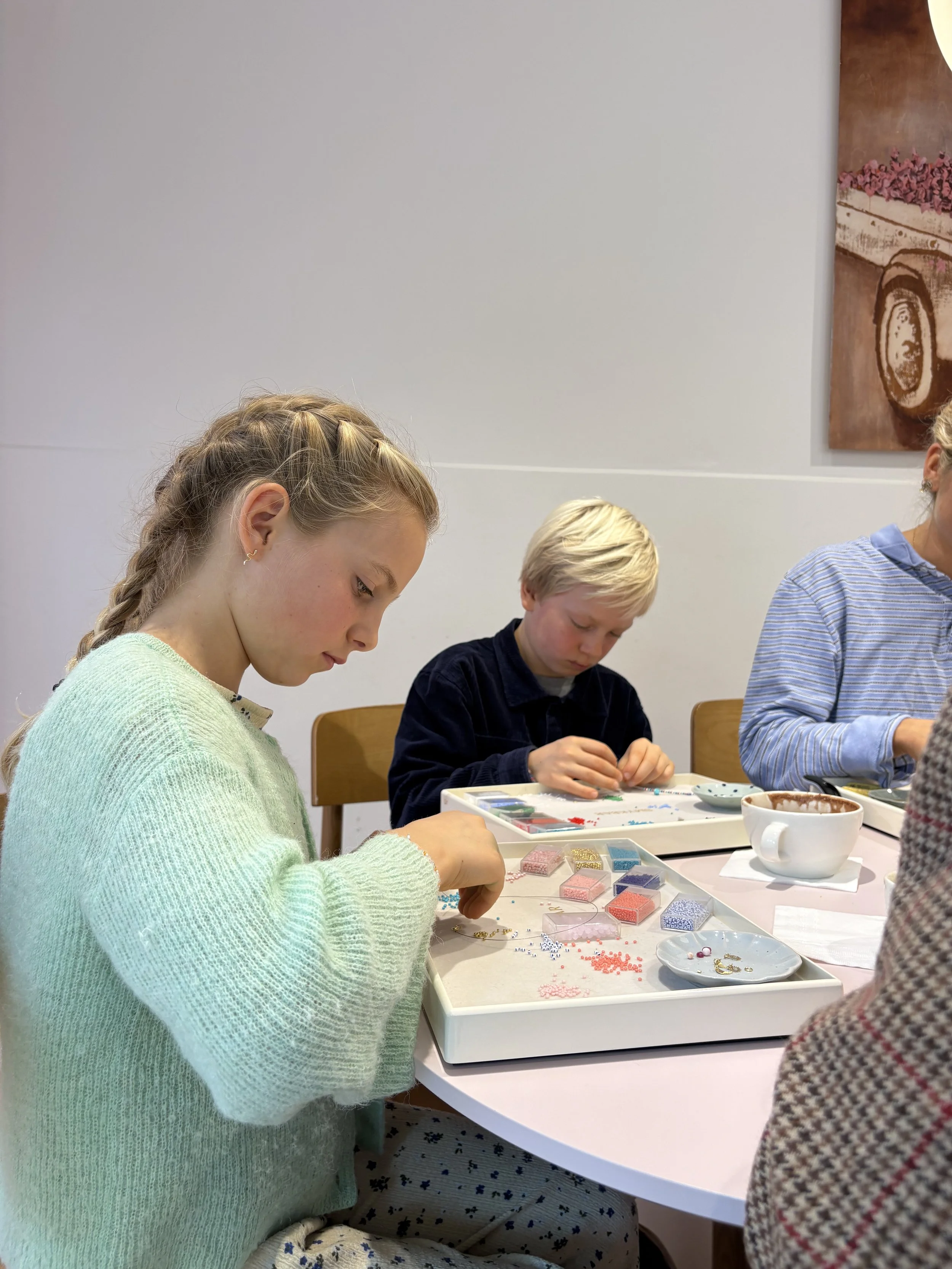 Med SMYKBAR Kids-pakken får børnene alt, de skal bruge for at skabe deres eget personlige armbånd. Glasperler og smykkekit er inkluderet, og barnet kan derudover vælge 5 ægte ædelsten eller perler fra SMYKBAR Kids-bakken. Som en del af oplevelsen er der også en forfriskende øko-lemonade.
