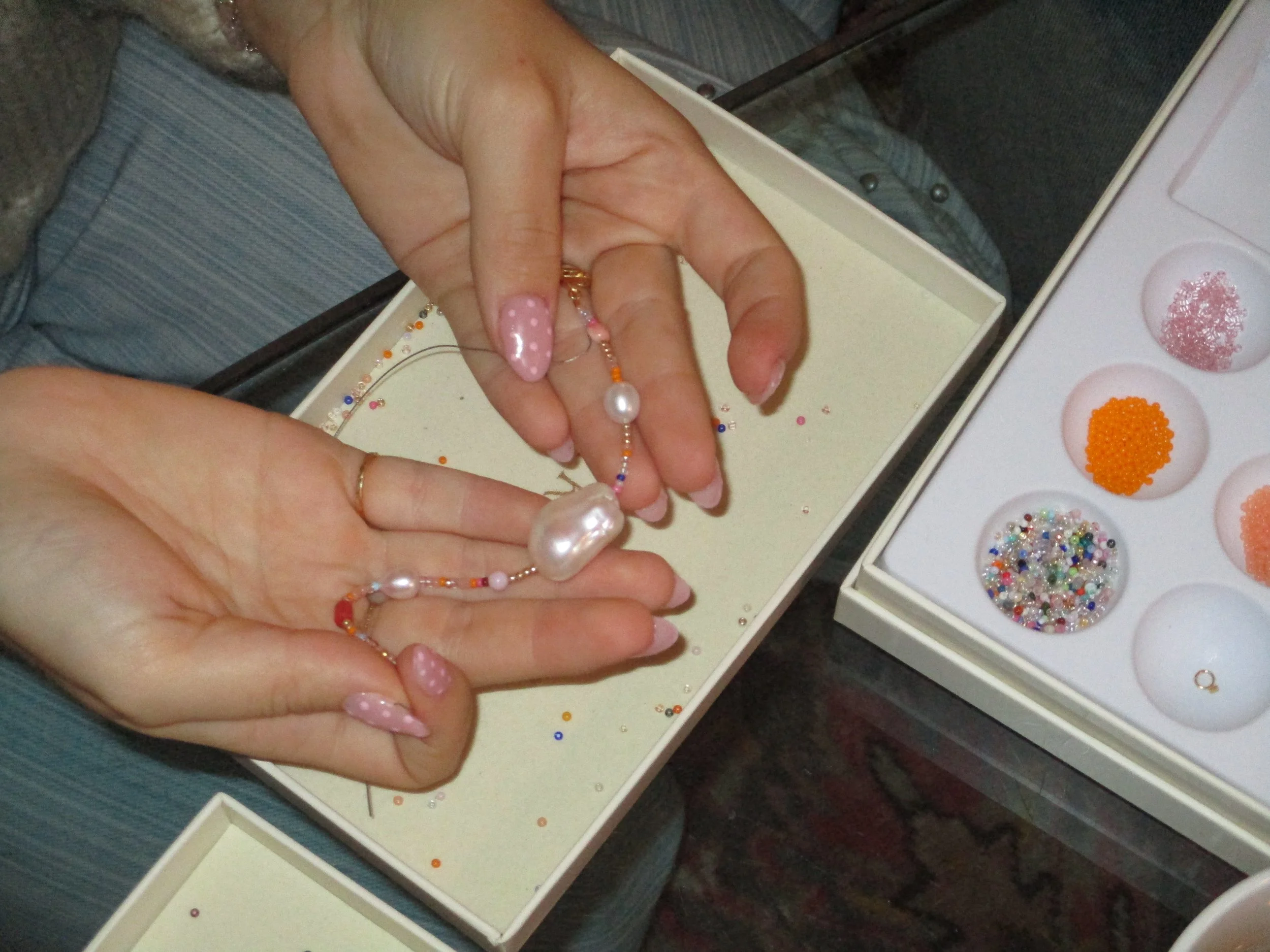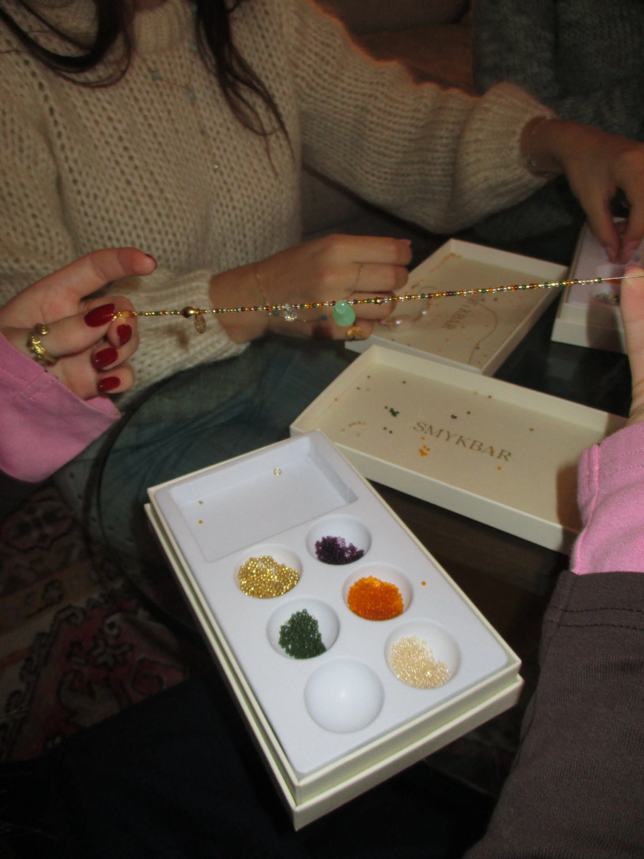 Vil I gøre oplevelsen ekstra særlig, kan en fra jeres team besøge en af vores caféer og sammensætte egne bokse med farverige glasperler, ægte ferskvandsperler, sten og vedhæng. Vi sørger for, at alt bliver pakket smukt og klar til brug.