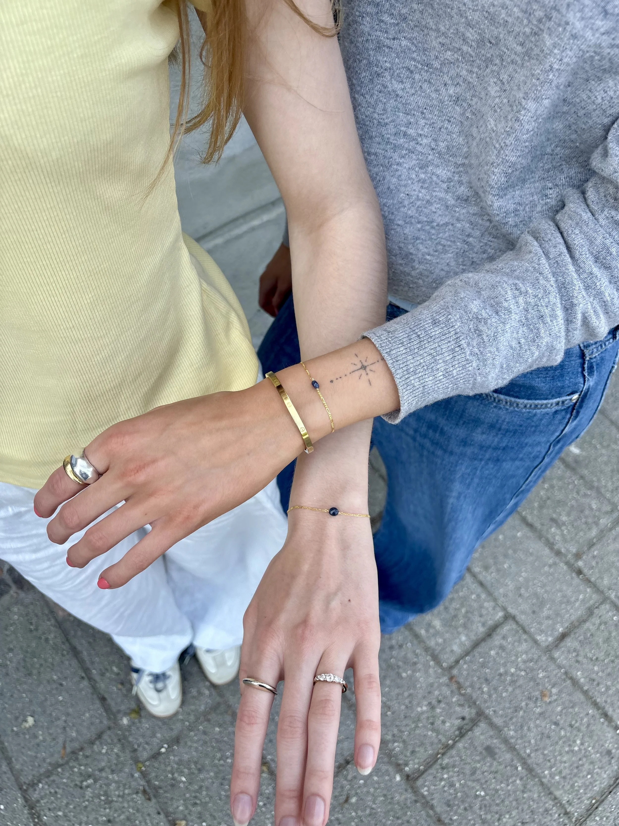 You can choose from our chain styles in solid 925 sterling silver or 18k gold-plated sterling silver. You also have the option to add a personal touch with our selection of gemstones and freshwater pearls, which can be attached to your bracelet.
